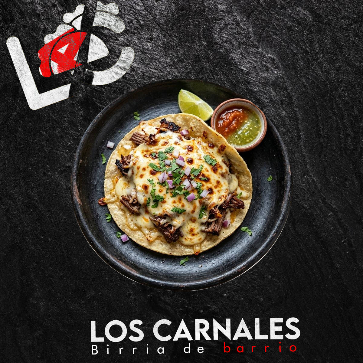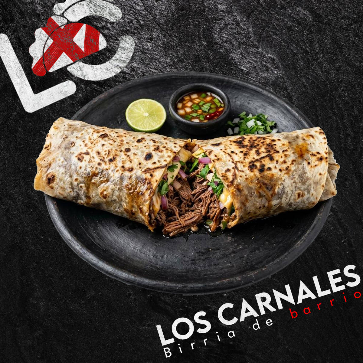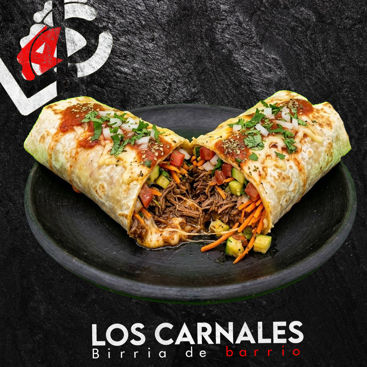 Algo extraño apareció en la cocina de Los Carnales… Tortilla de harina extra grande rellena de birria jugosa, queso derretido, lechuga fresca, zanahoria rallada, jitomate, cebolla, cilantro y aderezo César. Enrollado estilo shawarma y dorado a la plancha. Algunos dicen que no es un shawarma… es una anomalía del sabor. 🌯🔥