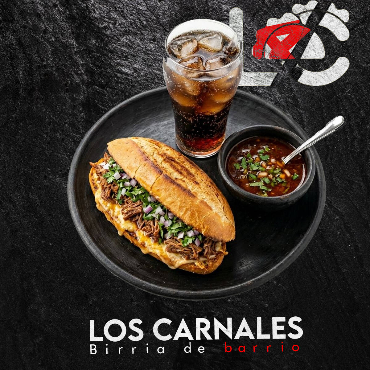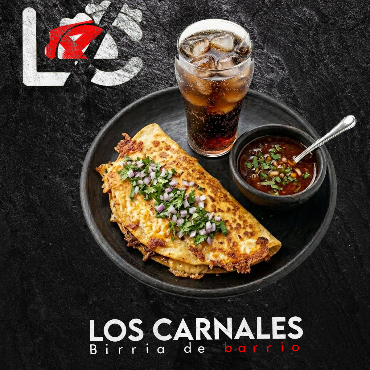 Nuestra quesabirria bien doradita y cargada de sabor, acompañada de consomé calientito con carne y refresco. Ideal para cuando traes antojo fuerte y quieres algo bien servido.