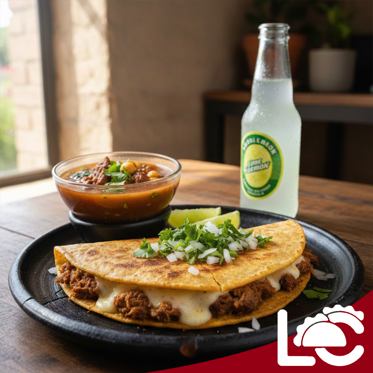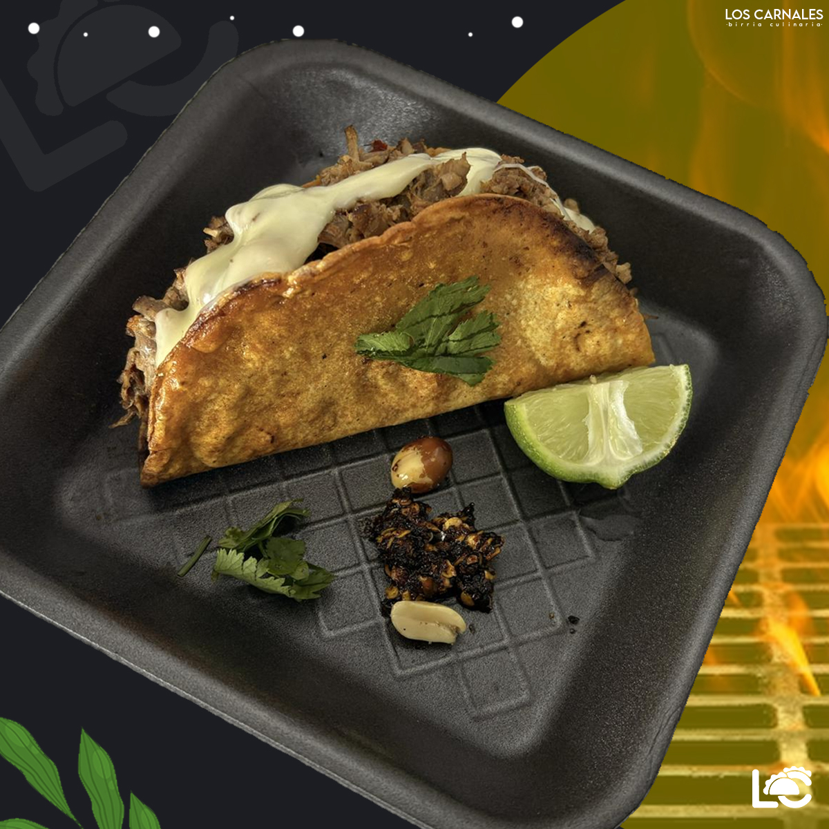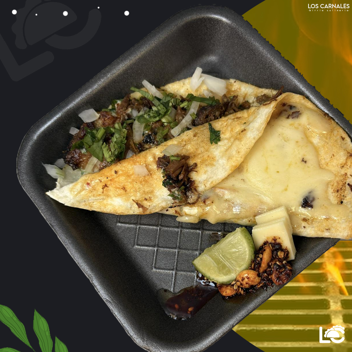 doble tortilla de harina rellena de birria de res jugosa, mucho queso derretido y verdura fresca, bien dorado y crujiente por fuera. Una bomba de sabor, solo para valientes 🔥