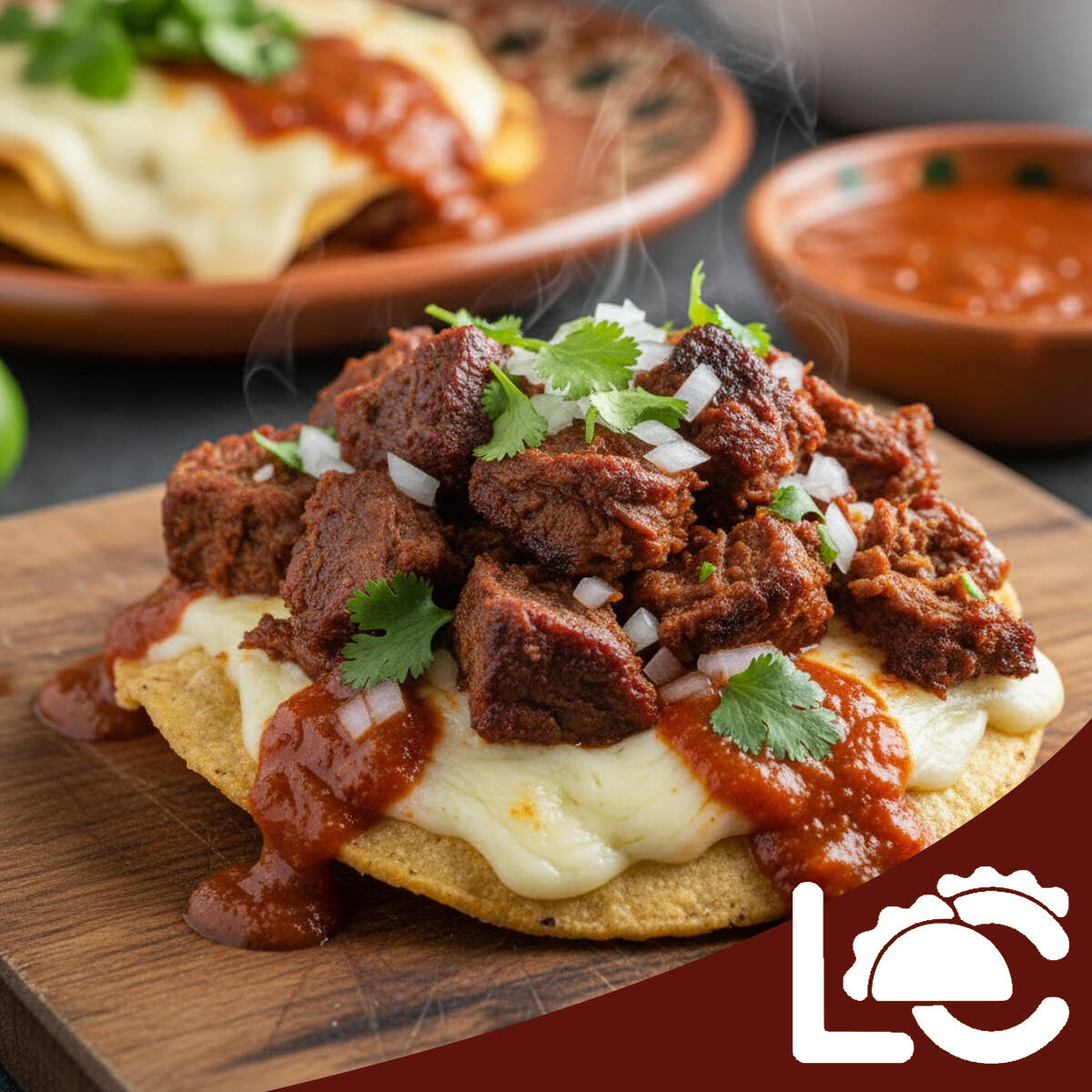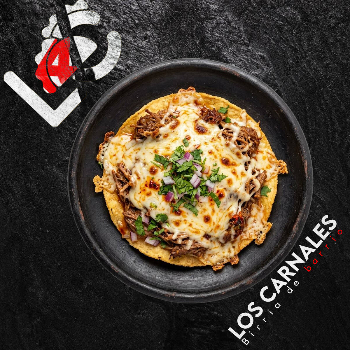 Doble tortilla de maíz crujiente con queso gratinado, birria de res y verdura fresca encima. Pequeño pero poderoso, perfecto para acompañar o para antojo intenso 😎