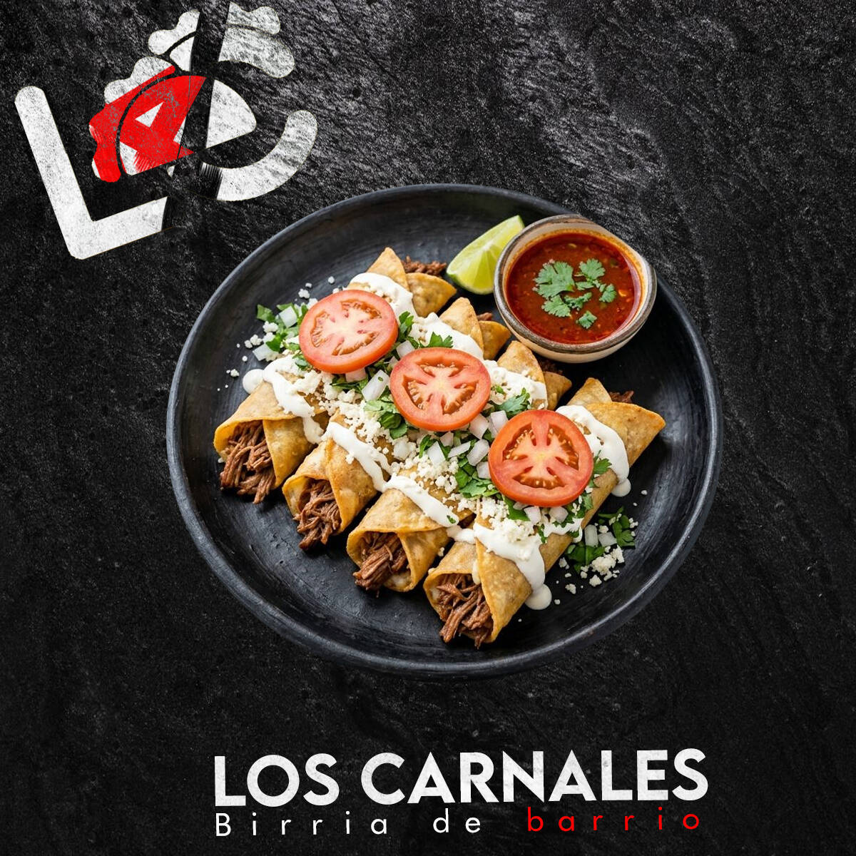 órden de 4 flautas bien doraditas de jugosa birria de res, servidas con queso, crema, jitomate y cebolla