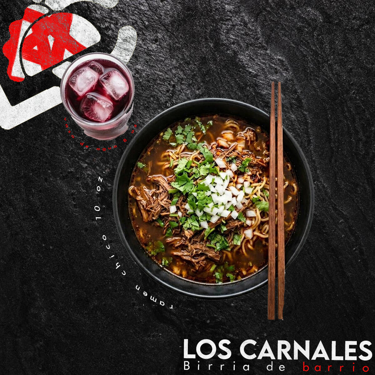 Deliciosa sopa estilo ramen noodle soup, servida con caldo denuestra deliciosa birria, con carne (vaso de 10 oz.) acompañado de un vaso de agua de sabor (8 oz.)