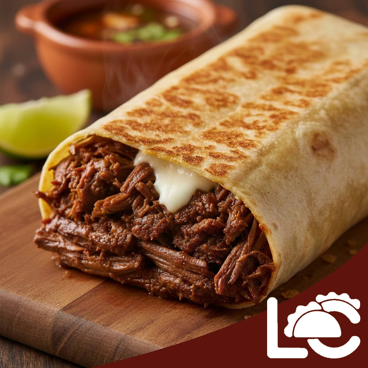 Tortilla de harina doradita con birria de res jugosa, queso fundido y un toque de verdura fresca. Acompañada de limón y salsa para que la armes a tu gusto. Ideal si traes mucha hambre 🤤