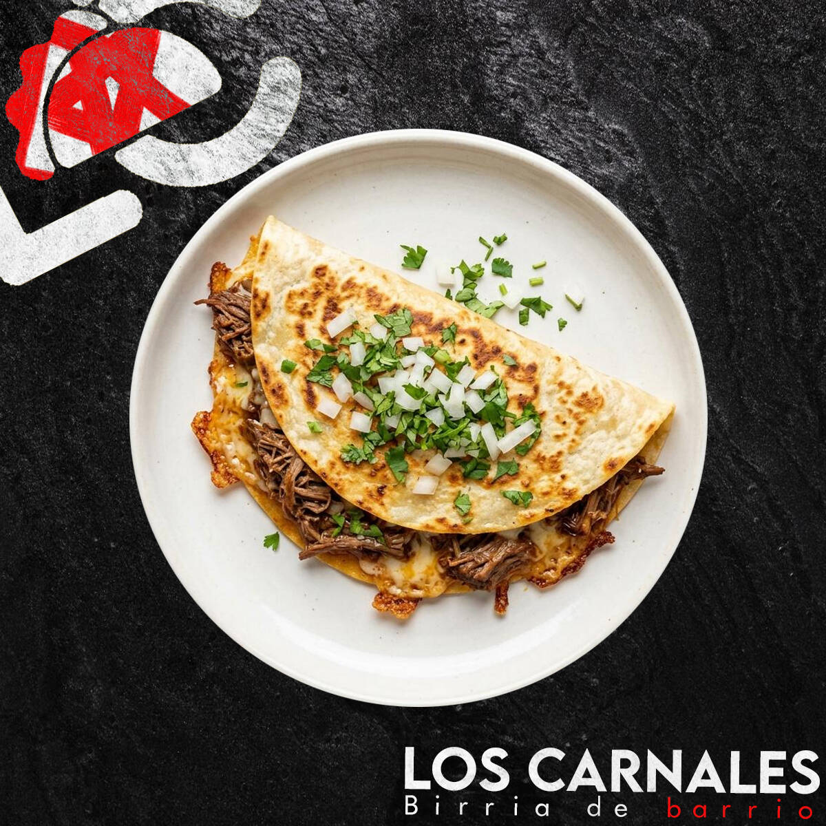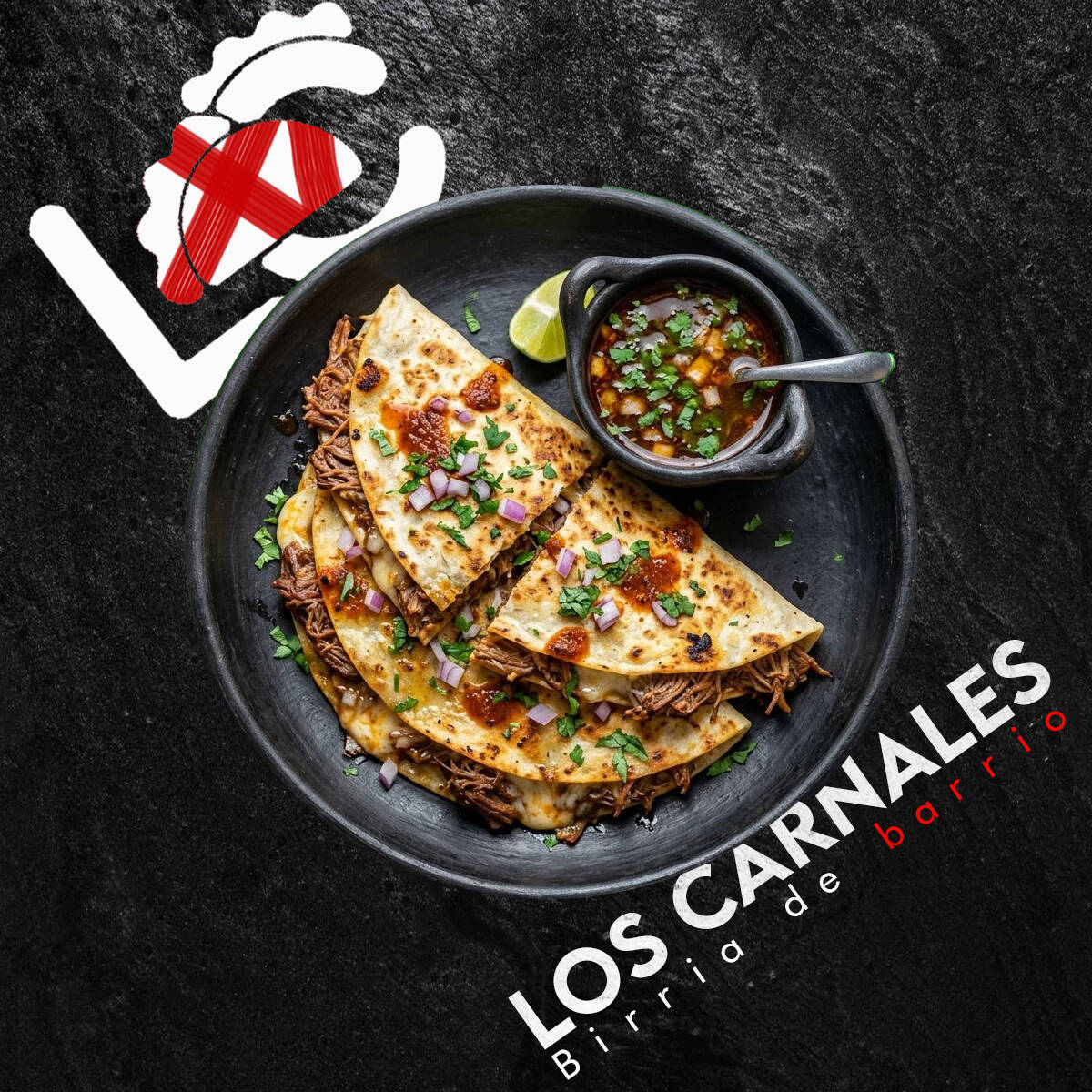 deliciosa, jugosa y calientita quesabirria, rellena de nuestra más jugosa birria cargada de su propio consomé, servida con queso gratinado cebolla, cilantro y salsa a parte