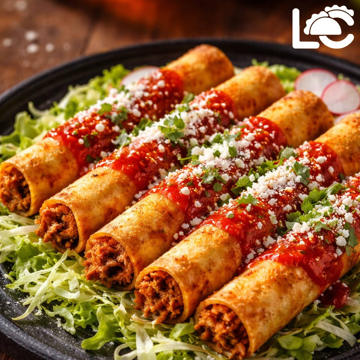5 tortillas de maíz rellenas de birria jugosa, doradas al momento hasta quedar crujientes. Se sirven jitomate, crema, queso y salsa de la casa. Crujientes por fuera, suaves y llenas de sabor por dentro.