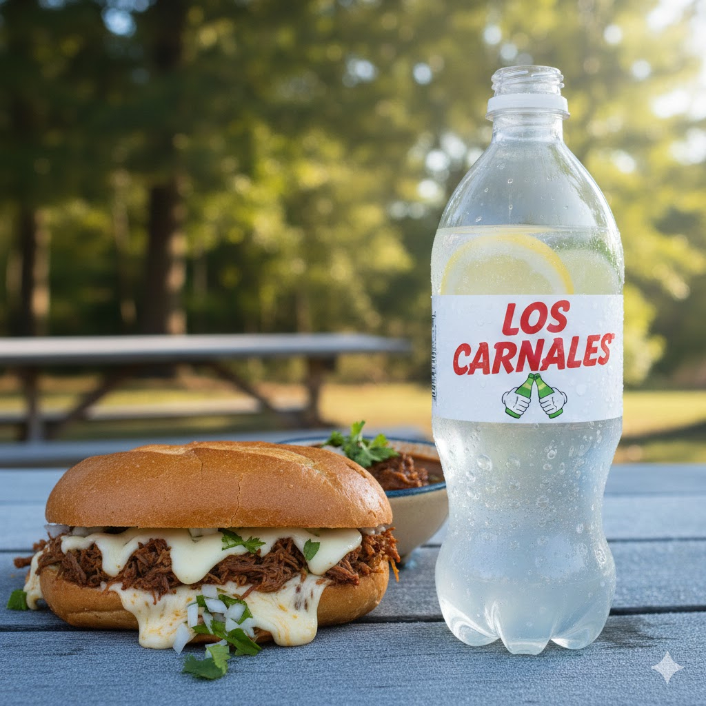 torta de birria doradita, con verdura y salsa a parte, incluye un frío y delicioso refresco de sabor 400 ml y consomé con carne