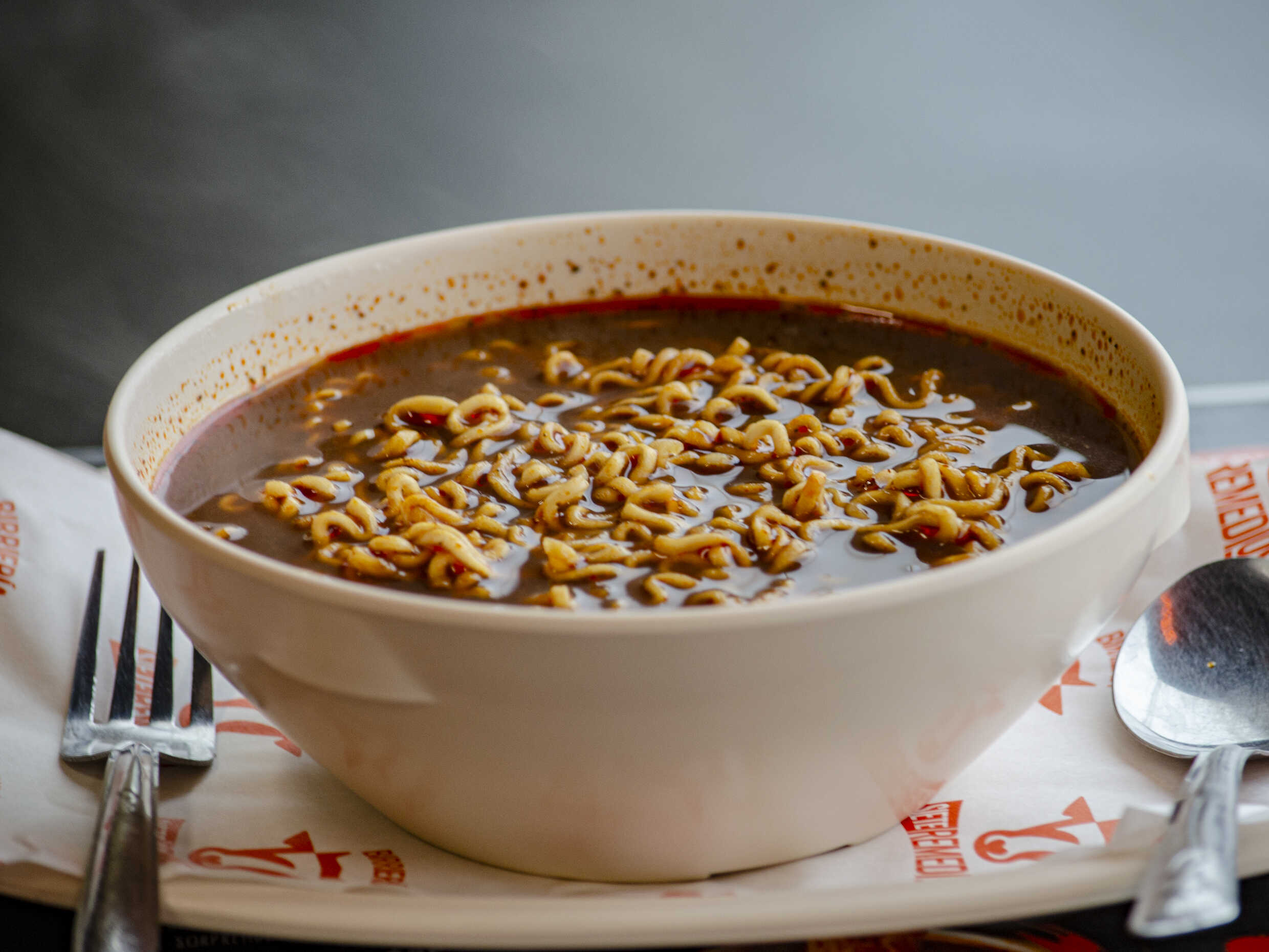 Fideos chinos servidos en consomé de la casa. Con un toque mexicano.