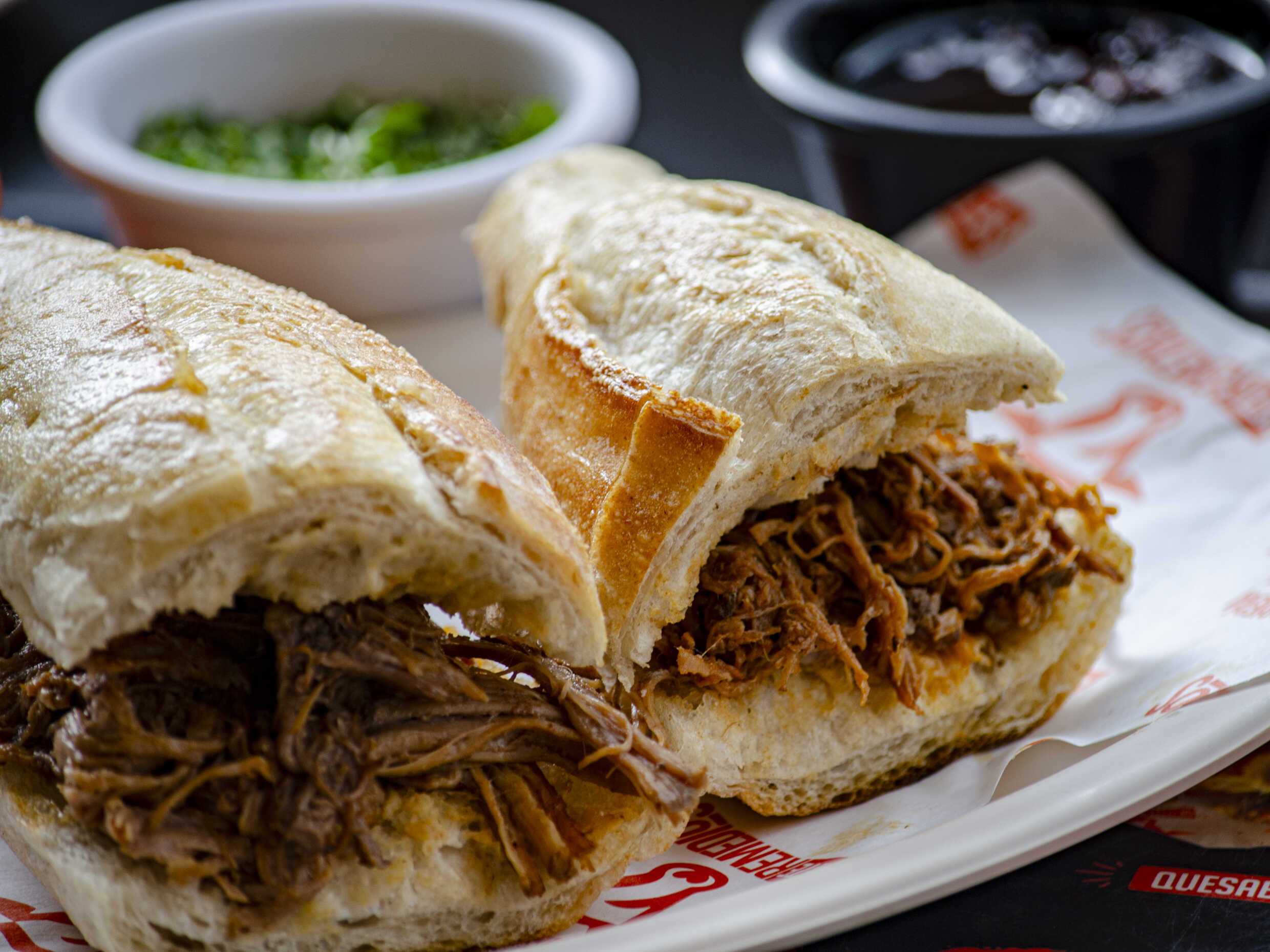 Bolillo relleno de nuestra birria acompañada de queso gratinado.