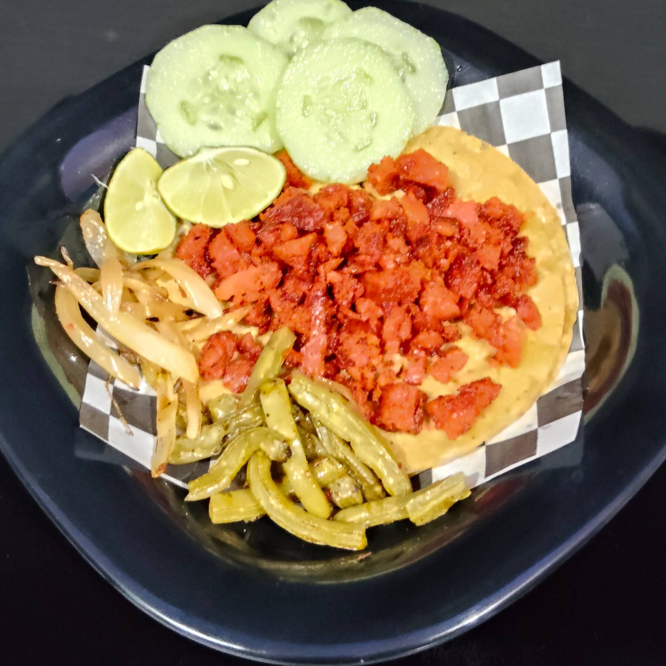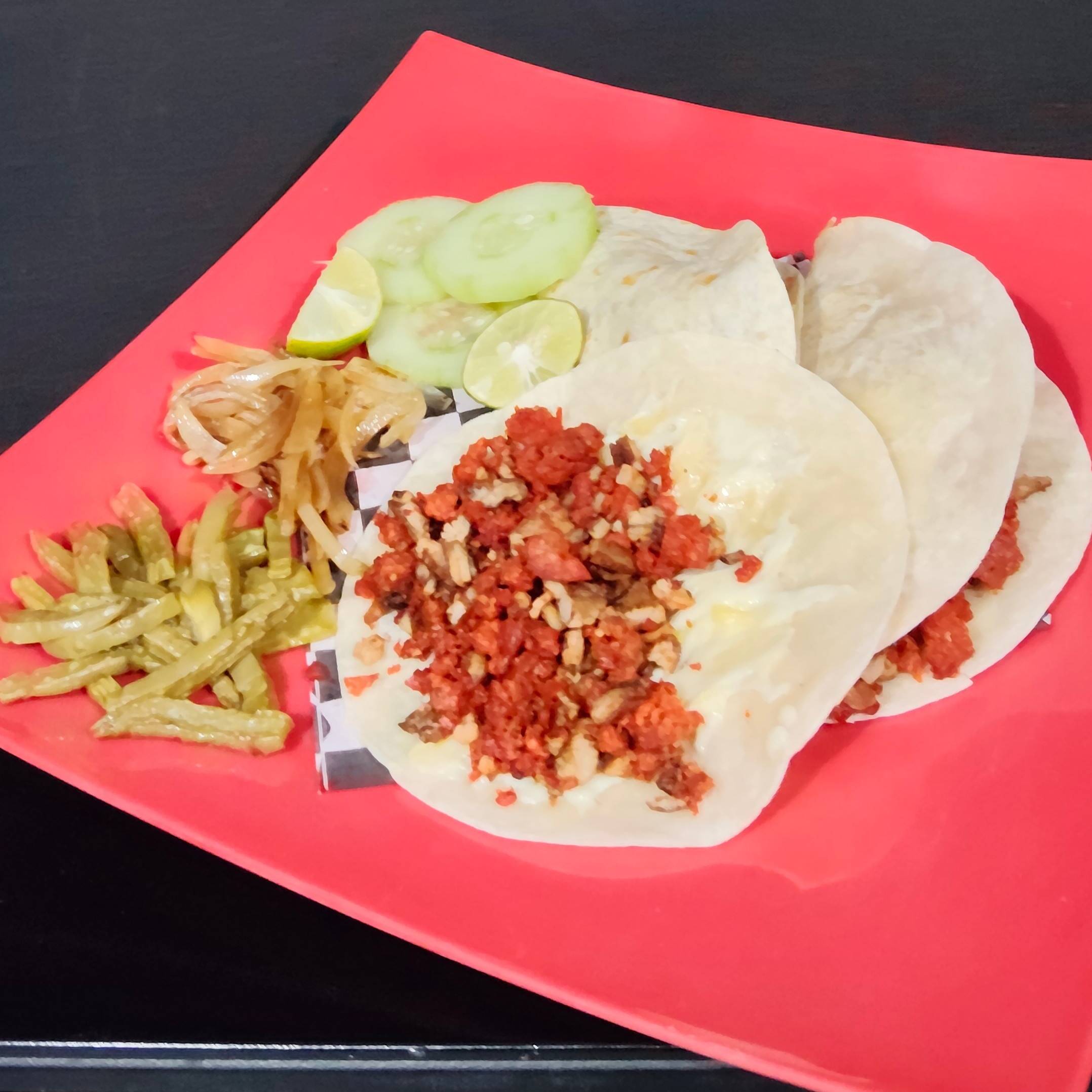 Tacos de Chorizo de tortilla normal acompañados con nopalitos, cebolla caramelizada y pepinos.