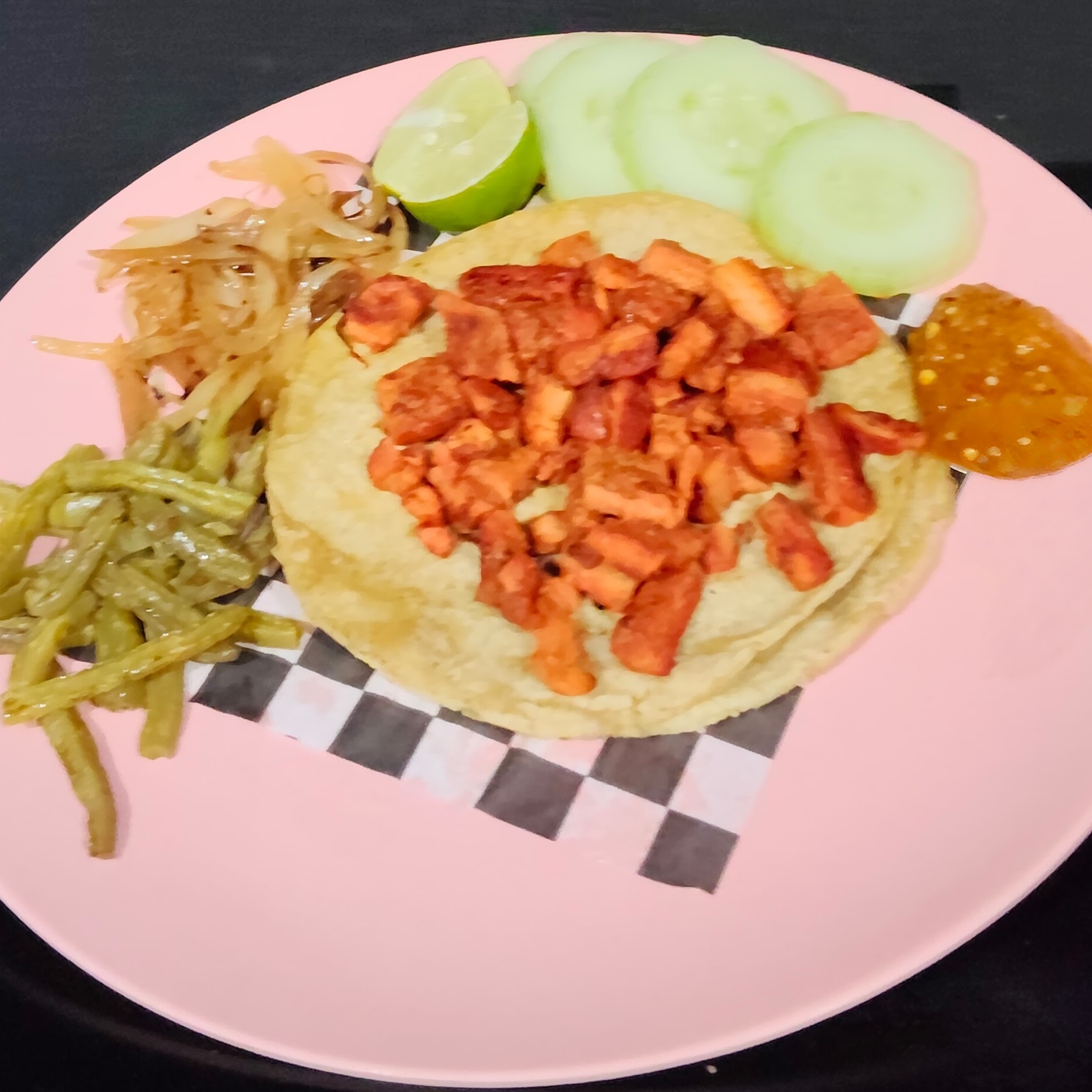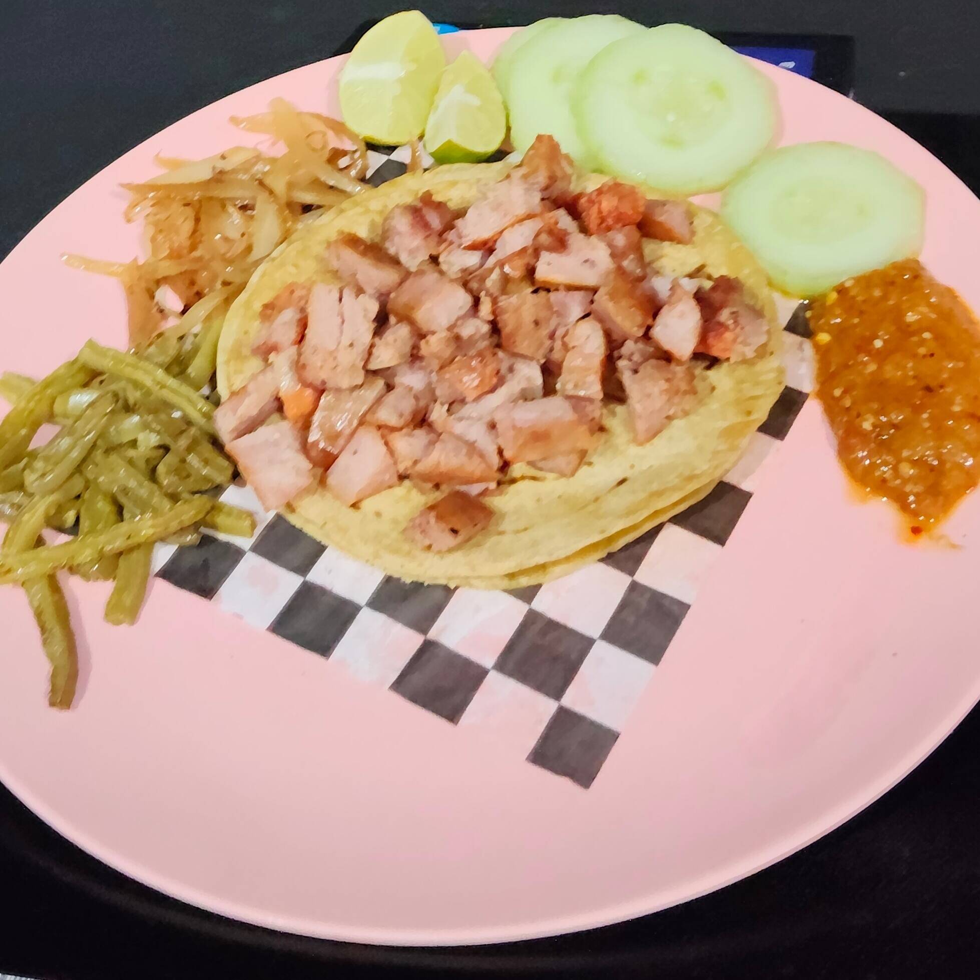 Tacos de Bistec Adobado de tortilla normal acompañados con nopalitos, cebolla caramelizada y pepinos.
