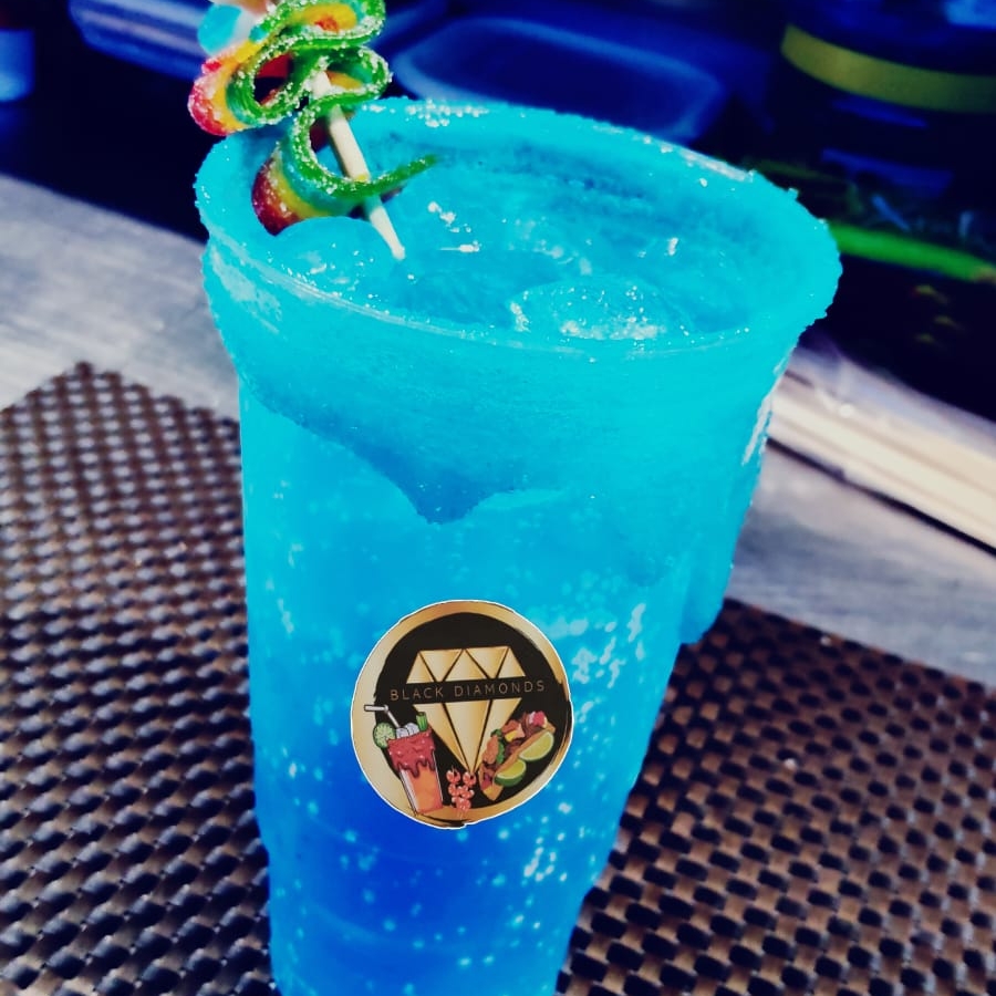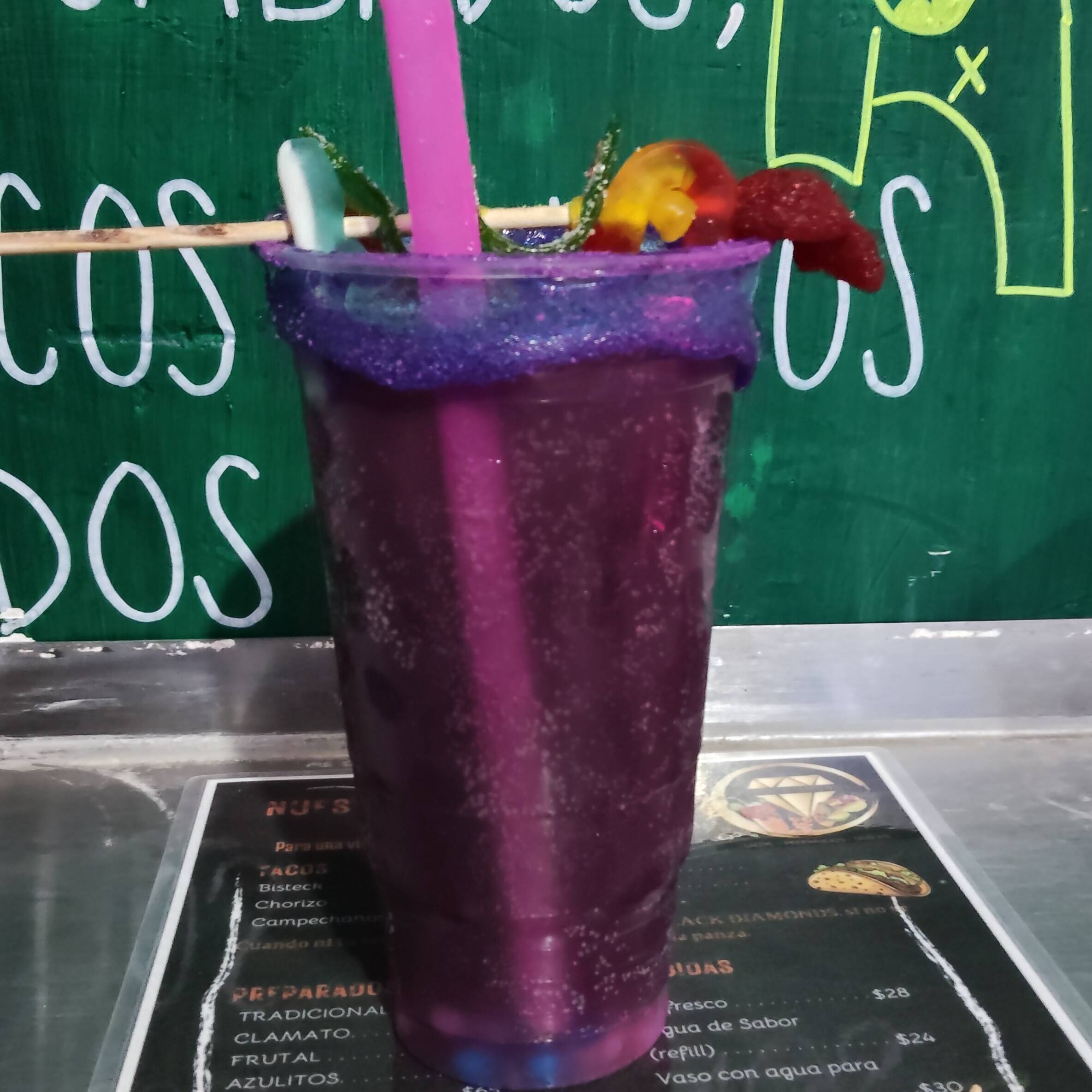 Agua mineral, sprite, volt, bolas explosivas de azúcar, jarabe de mora azul, gomitas