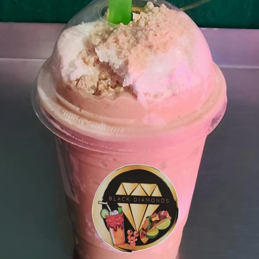 Pulpa de fresa natural, hielo, limón, sal, Tajín, escarchado al gusto.