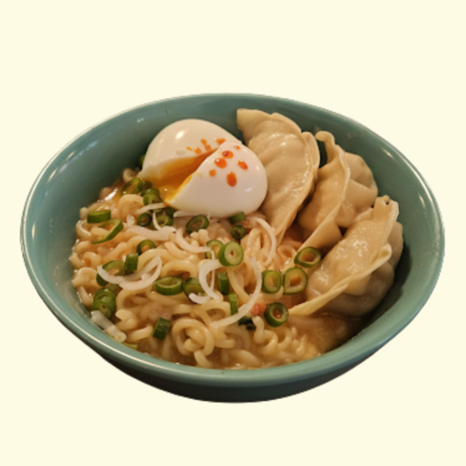 Ramen condimentado con cilantro, acompañado con huevo hervido, cebollin y dumplings de cerdo y vegetales