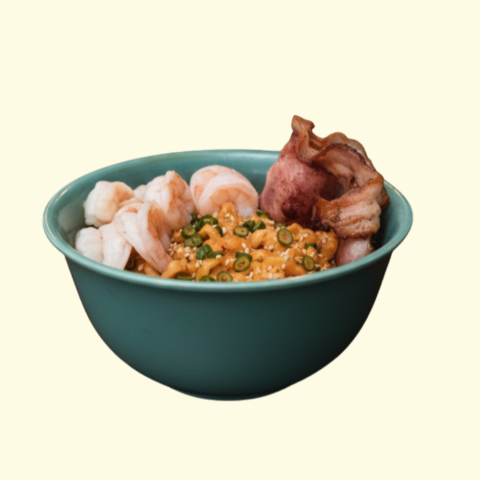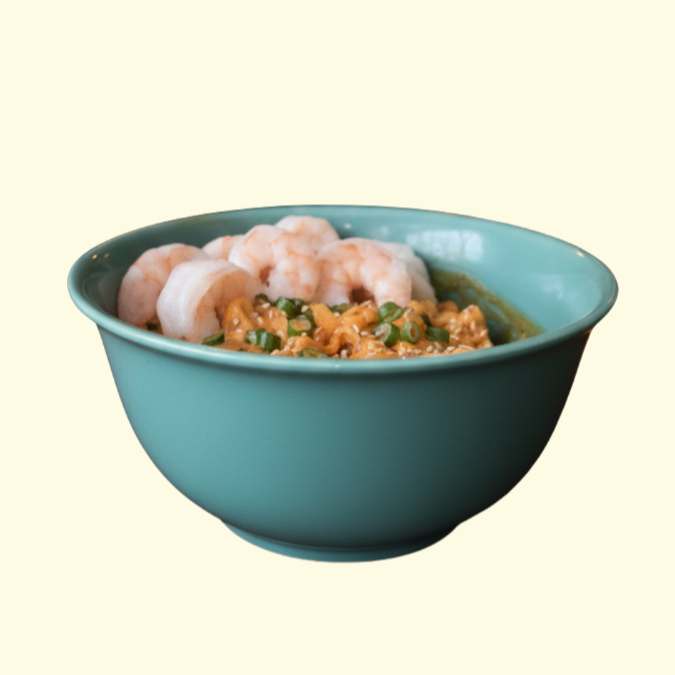 Ramen a la carbonara acompañado de queso mozarela y camarones salteados, adornado con cebollin y ajonjolí