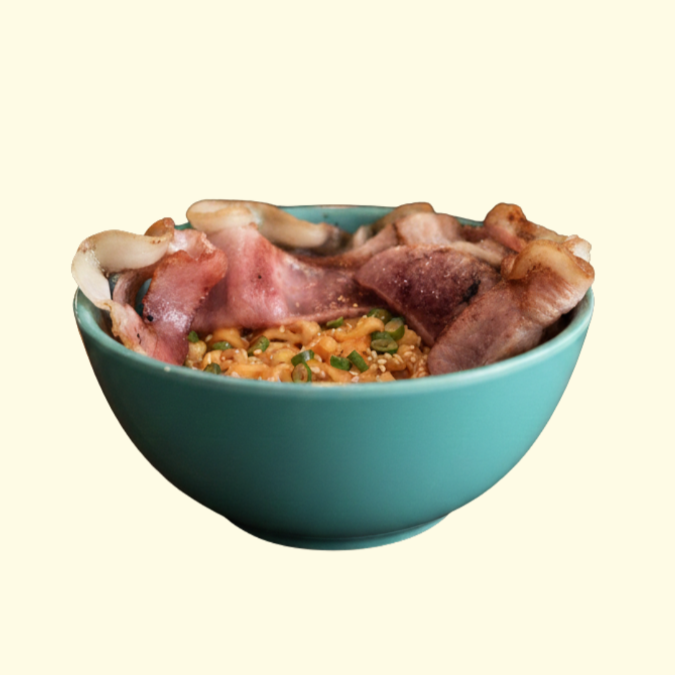 El ramen de la casa, ramen sazonado a la carbonara acompañado de tocino, camaron y queso mozarela