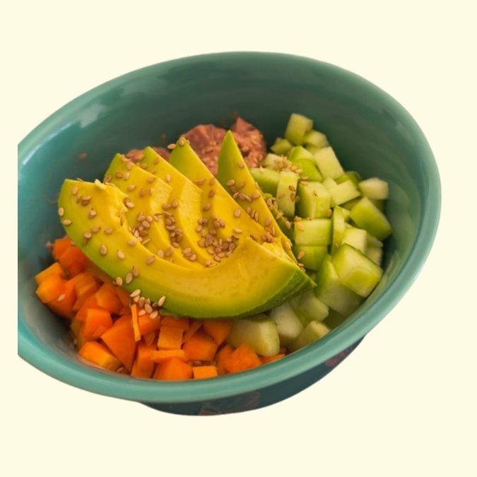 Bowl de arroz de sushi, acompañado de pepino, zanahoria, aguacate y atún sazonado con aderezos de la casa