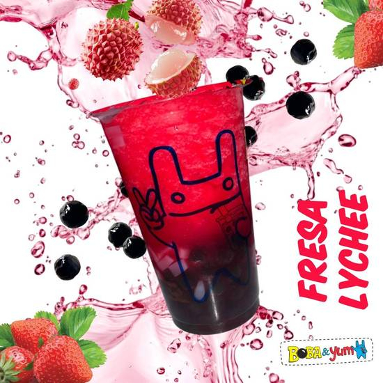 Bebida a base de agua 16 oz, tapioca X1, con fresa y jelly de lychee.
