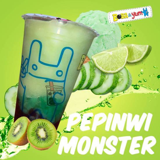 Bebida a base de Monster 16 oz, tapioca X1, con kiwi, pepino, limón, helado de limón y jelly de manzana verde.