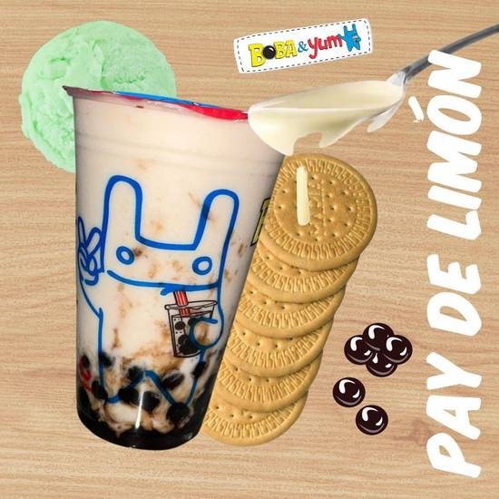 Bebida a base de leche 16 oz, tapioca X1, con galletas Marías, lechera, limón y helado de limón.