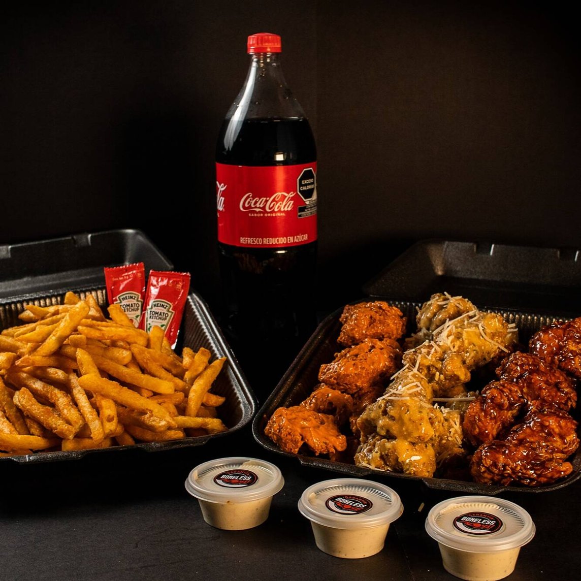 750g de boneless bien crujientes y jugosos, con papitas doradas, apio fresco pa’ equilibrar, aderezos y 2 salsas a elegir pa’ que no falte el punch. Además, 2 bebidas bien frías pa’ bajarlo todo como se debe. 🔥 Perfecto pa’ compartir… o para los que comen como campeones.