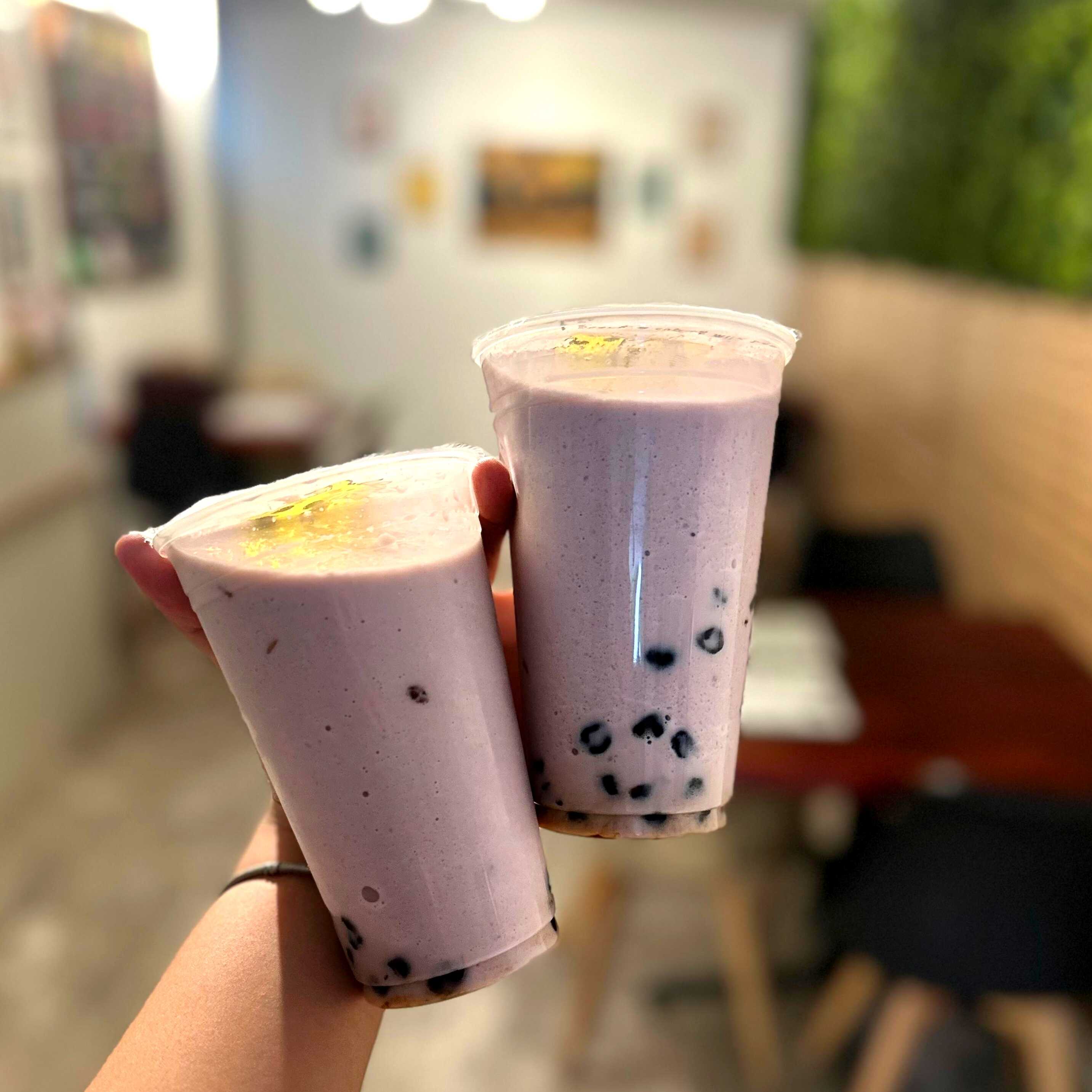 Frappé con su distintivo color lila, sabor dulce y ligeramente a nuez.