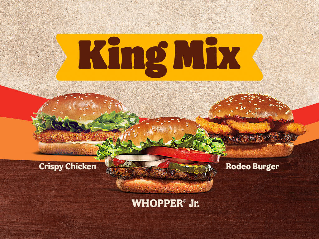 Las noches del Rey son para compartir con: 2 Rodeo Burger + 1 Whopper® Jr CON QUESO + 1 Crispy Chicken + 3 papas chicas.