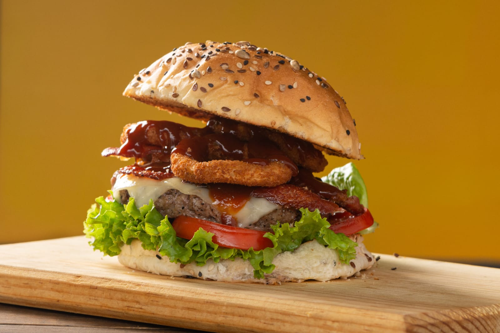 Hamburguesa de sirlón de 150 gr en pan brioche artesanal acompañado de queso gouda, aros de cebolla, tocino, bañada en salsa BBQ con lechuga y jitomate.