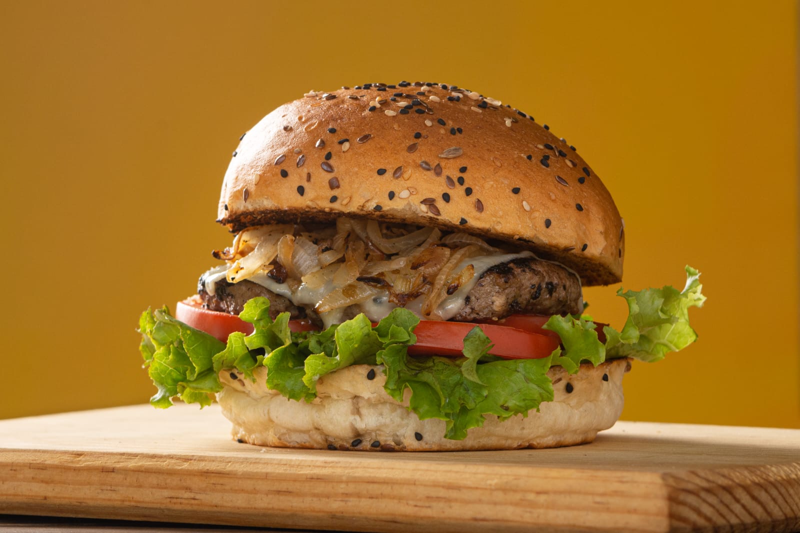 Hamburguesa de sirlón de 150 gr, en pan brioche artesanal acompañado de queso gouda, cebolla caramelizada, lechuga y jitomate.