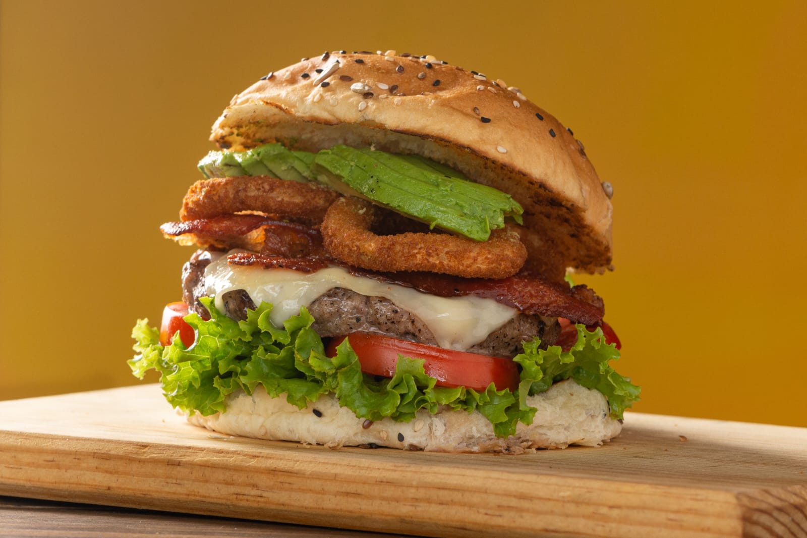 Hamburguesa de sirlón de 150 gr en pan brioche artesanal acompañado de queso gouda, queso americano, aros de cebolla, tocino, extra aguacate, lechuga y jitomate.