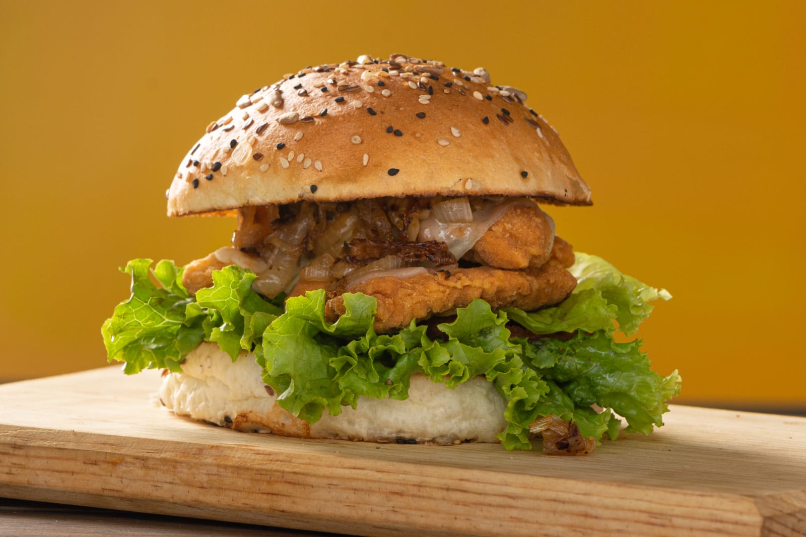 Hamburguesa de pollo empanizado super crujiente en pan brioche artesanal acompañado de queso gouda, cebolla caramelizada, lechuga y jitomate.