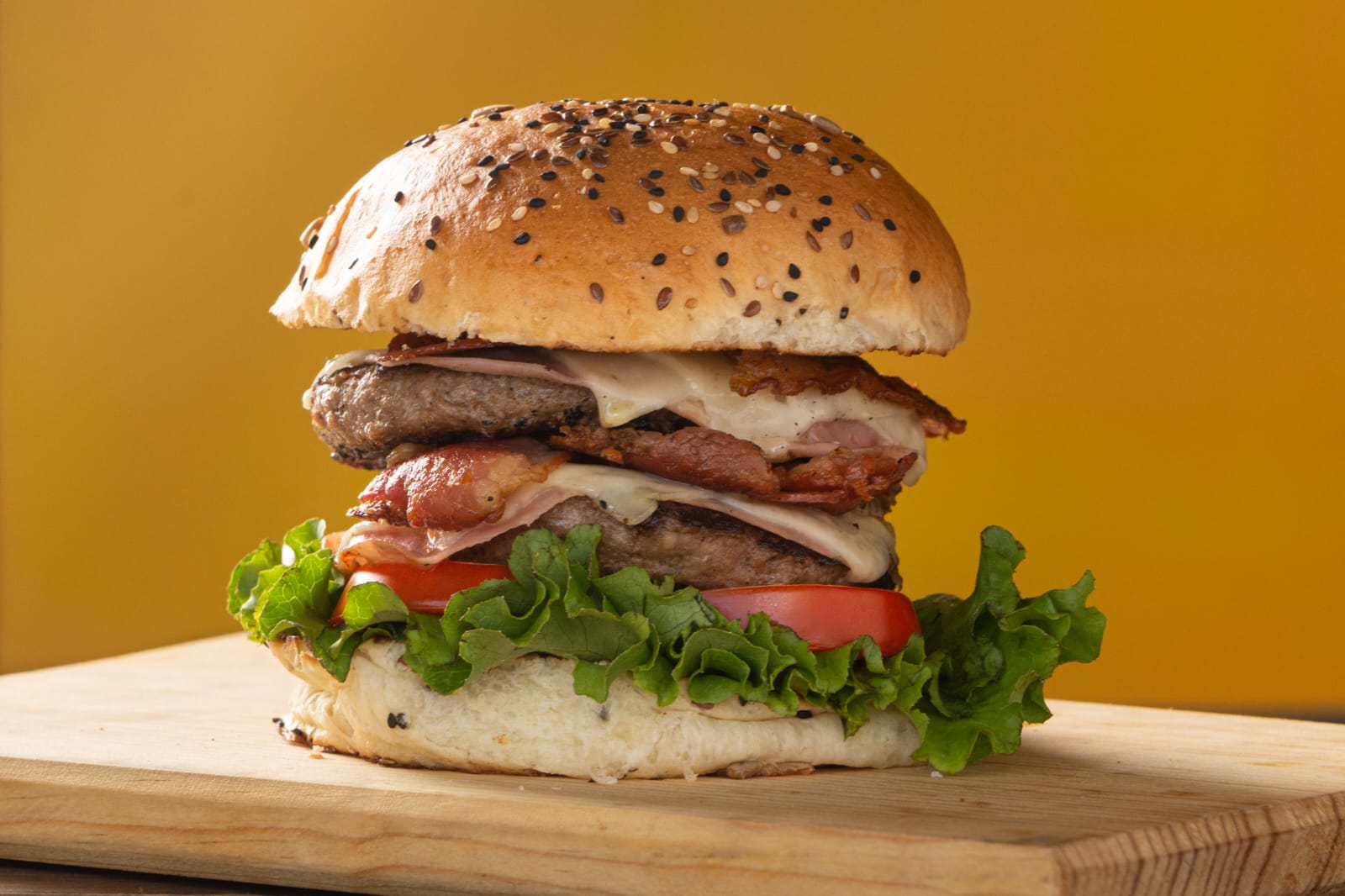 Doble hamburguesa de sirlón de 300gr, en pan brioche artesanal acompañado de doble queso gouda y amarillo, doble tocino y jamón, cebolla caramelizada, lechuga y jitomate.
