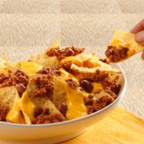 Totopos de maíz en cama de frijoles refritos y carne molida de res sazonado con tocino pico de gallo jalapeño y queso