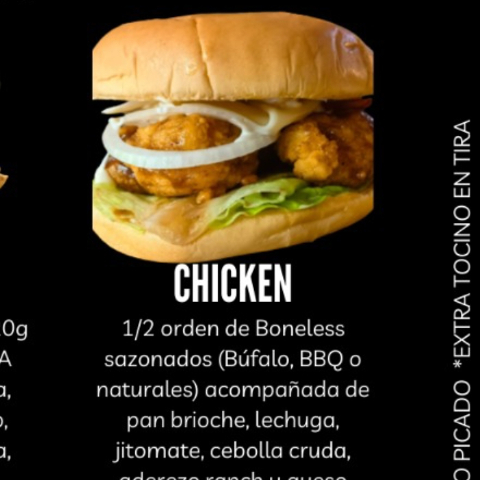 1/2 orden de boneless sazonados,pan brioche, lechuga,jitomate,cebolla,aderezo ranch y queso manchego