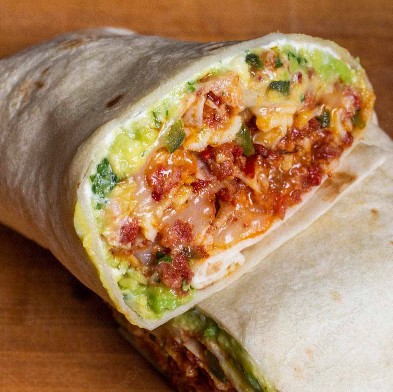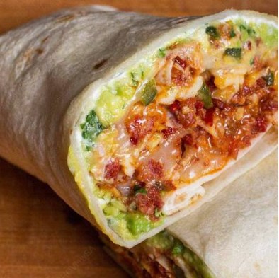 Burrito gigante, relleno de frijoles, aguacate, quesos mozzarella y manchego, pollo deshebrado, cebolla encurtida. Acompañados de papas a la francesa, limón y salsa de la casa.