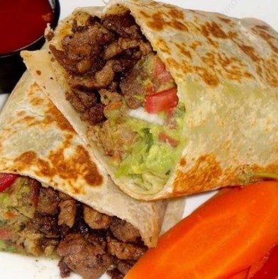 Burrito gigante, relleno de camarones y arrachera, frijoles, aguacate, quesos mozzarella y manchego, cebolla encurtida. Acompañados de papas a la francesa, limón y salsa de la casa.