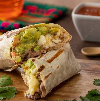 Burrito gigante, relleno de frijoles, aguacate, chorizo fundido con quesos mozzarella y manchego, cebolla encurtida. Acompañados de papas a la francesa, limón y salsa de la casa.