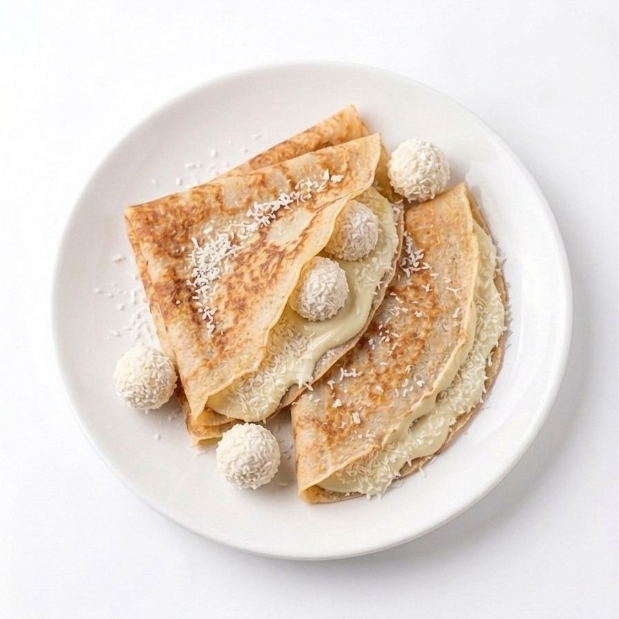 crepa con chocolate blaco, coco rayado y 3 piezas de chocolate raffaello.