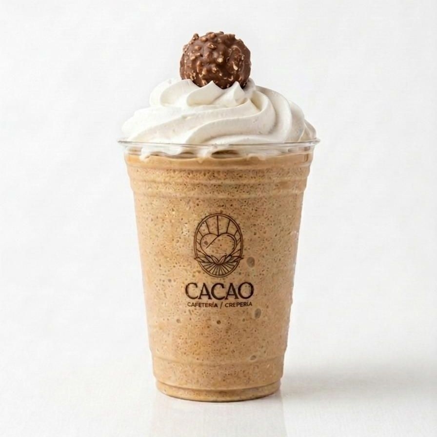 bebida fria sabor chocolate ferrero a base de leche, decorada con crema batida y un chocolate ferrero.