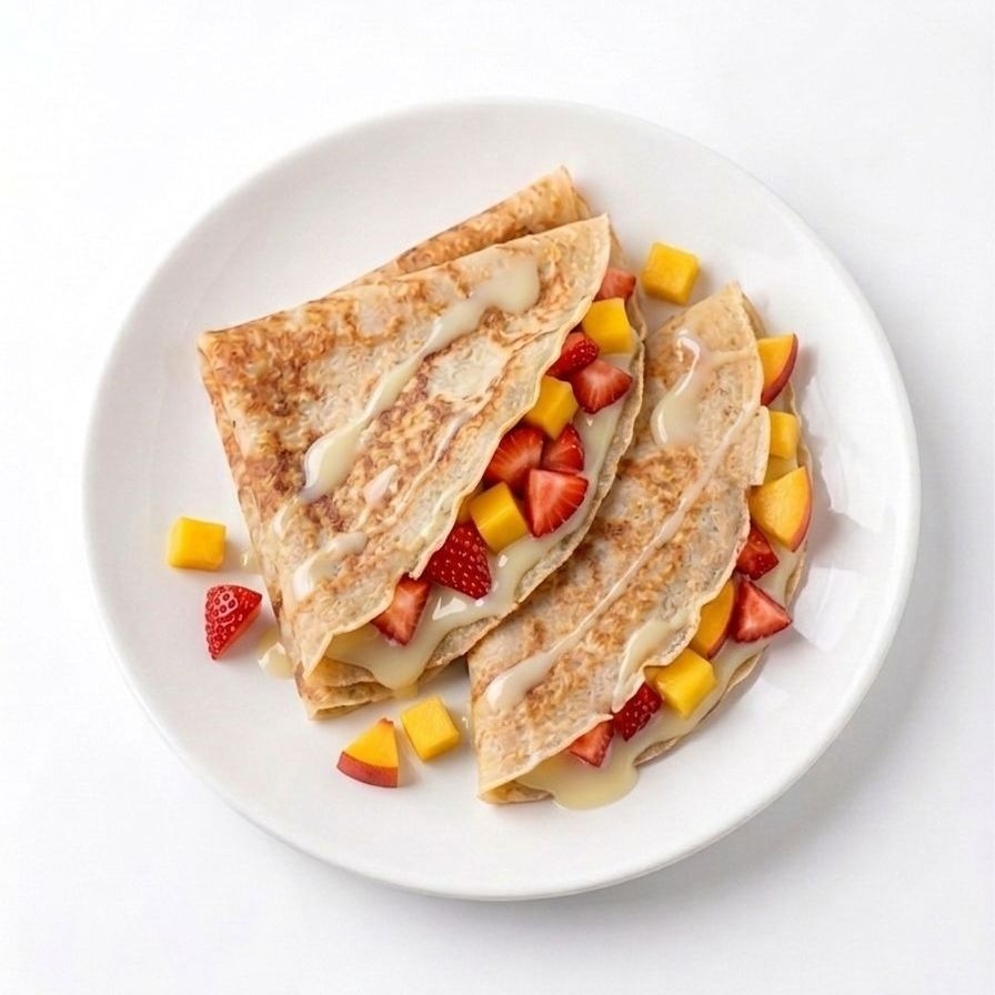 crepa con lechera, fresa, mango y durazno frescos.