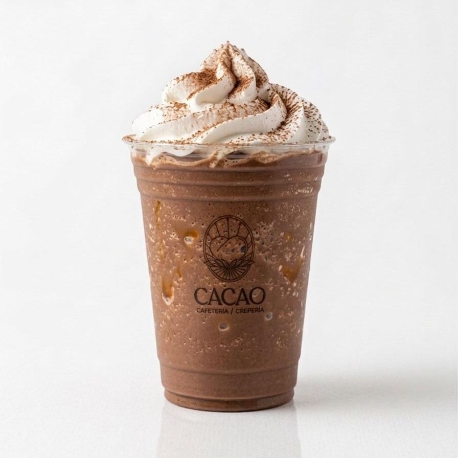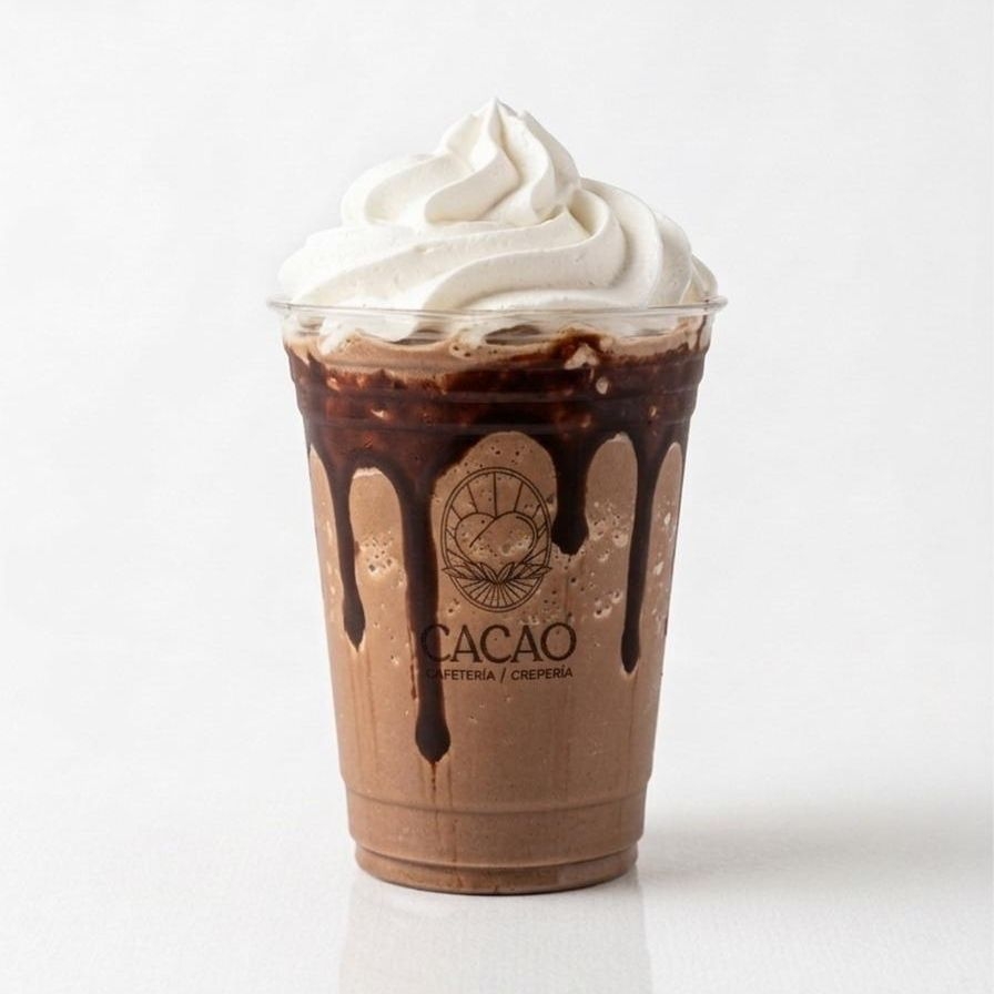 bebida fria sabor chocolate y café a base de leche, decorada con crema batida y un poco de jarabe sabor chocolate.