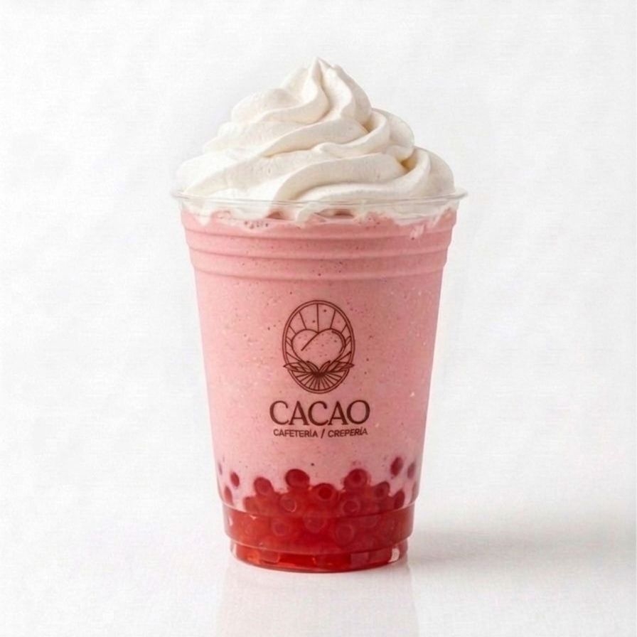 bebida fria sabor helado de fresa con perlas explosivas sabor fresa a base de leche, decorada con crema batida.
