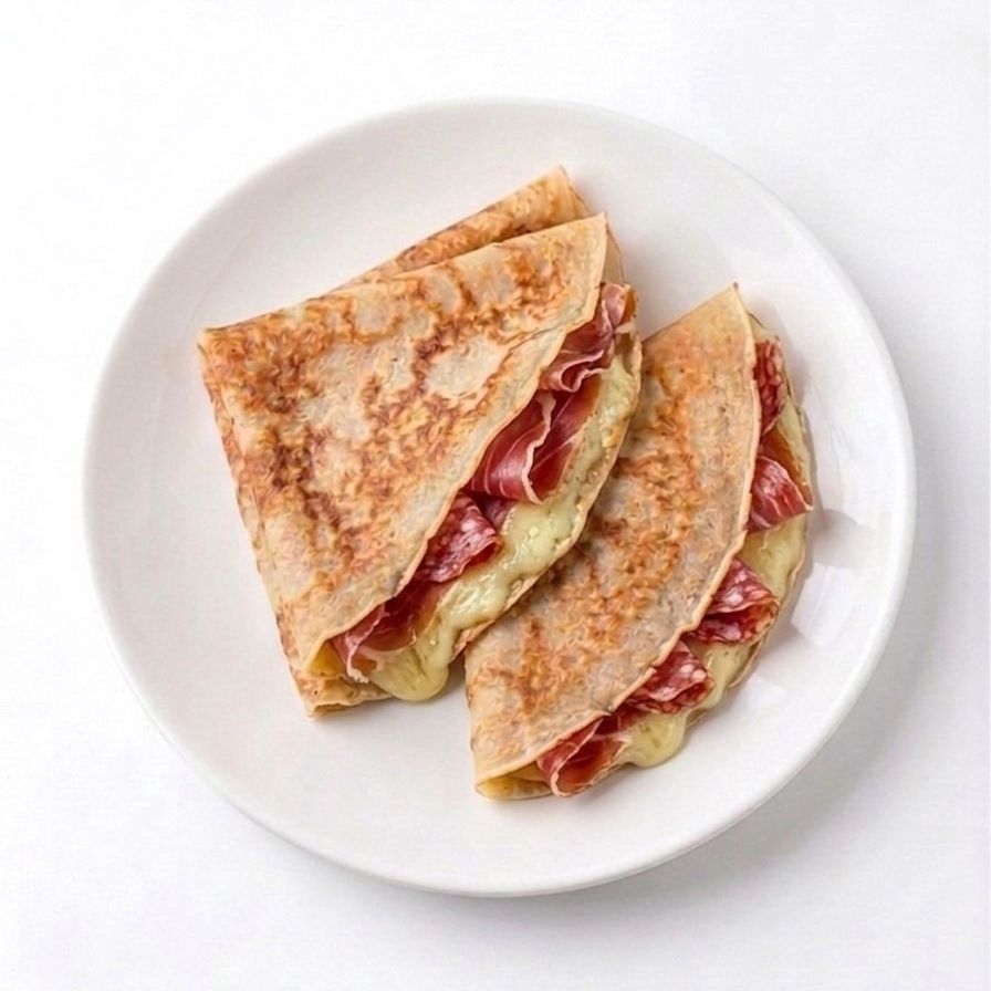 crepa con manchego, jamon serrano fresco y salami fresco.