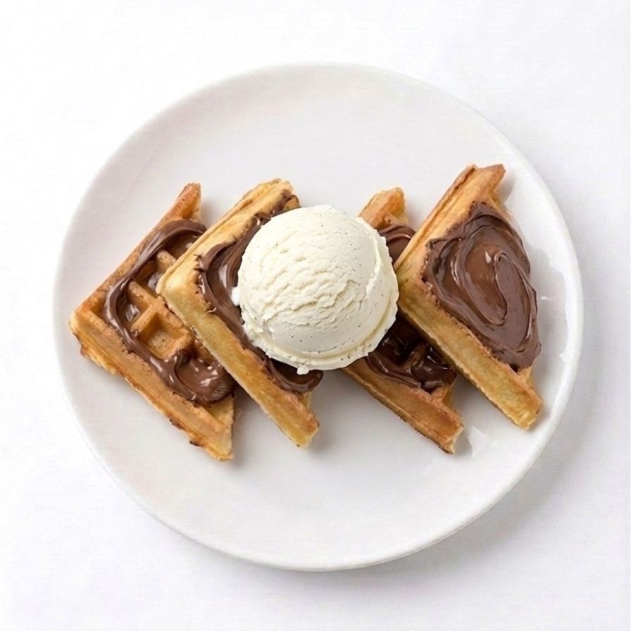 waffle con nutella y una bola de helado sabor vainilla.