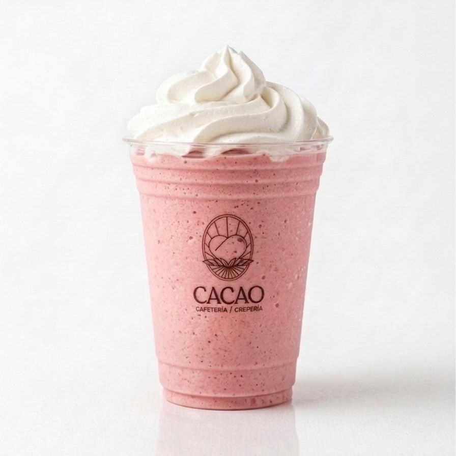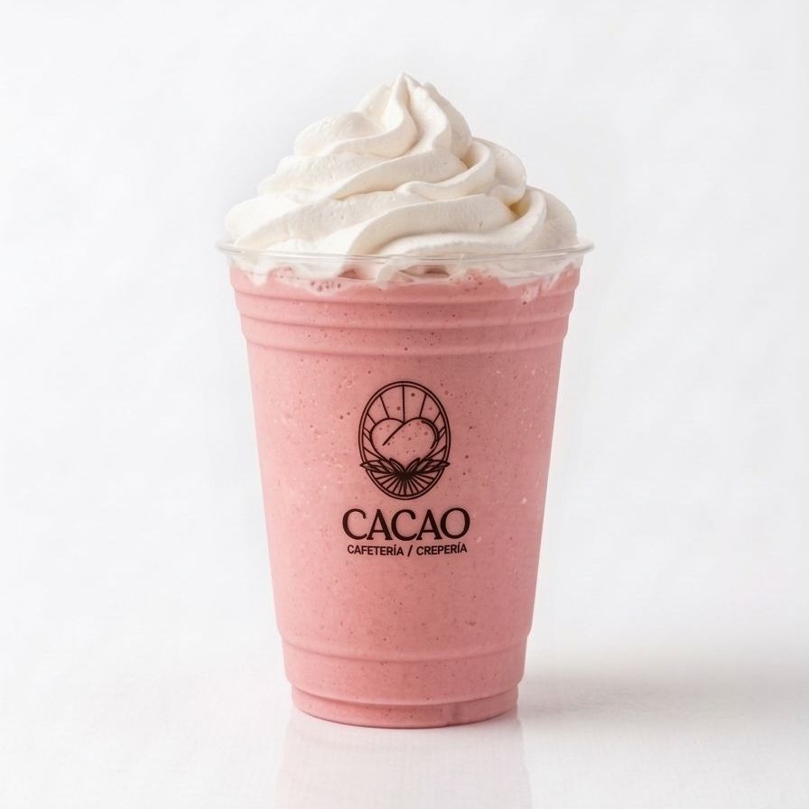 bebida fria sabor fresa a base de leche, decorada con crema batida.