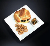 Panini de champiñones, aderezo, queso manchego y acompañado de pretzels.
