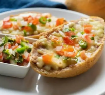 Bolillos con frijoles refritos y queso manchego, acompañados de salsa mexicana.