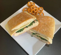 Panini de jamón de pavo y queso manchego, acompañado de pretzels.