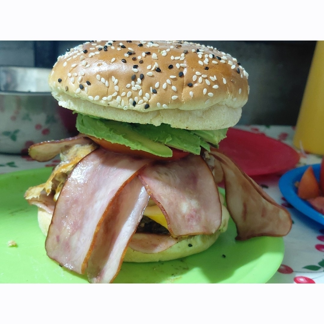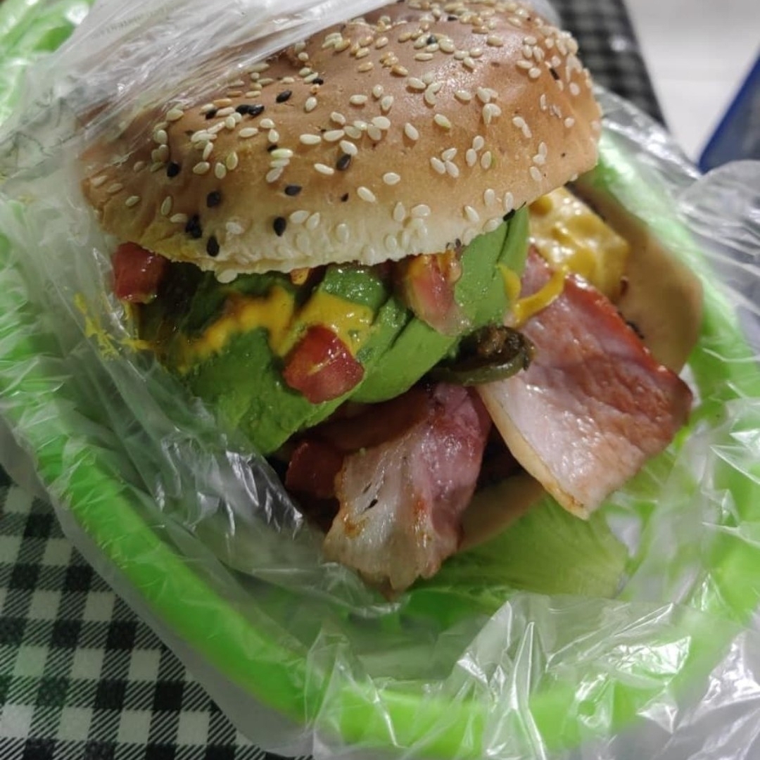 Carne de res receta casera, tocino, pan parrillero, jamon, queso amarillo, queso suizo, aguacate, jitomate, cebolla caramelizada, chiles toreados