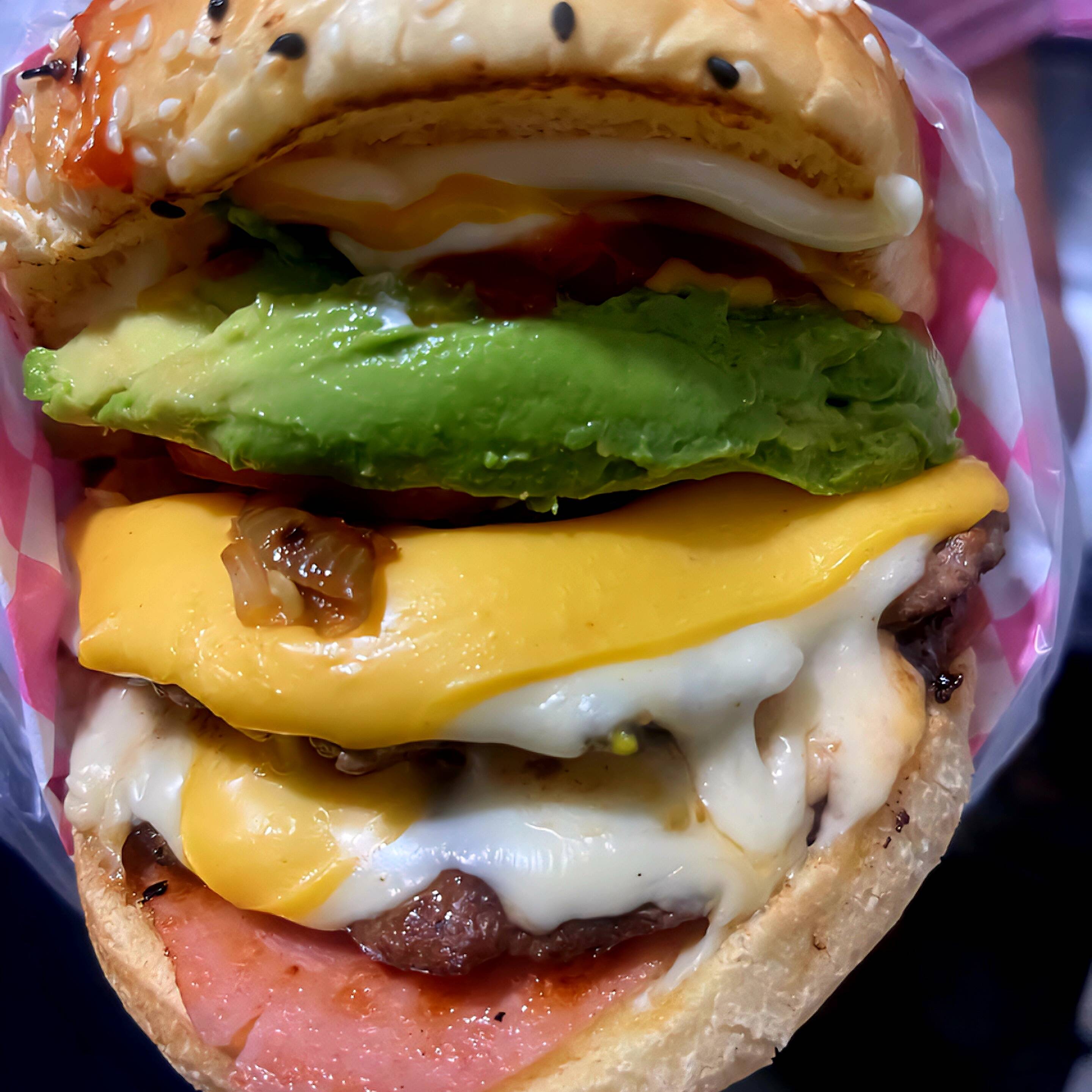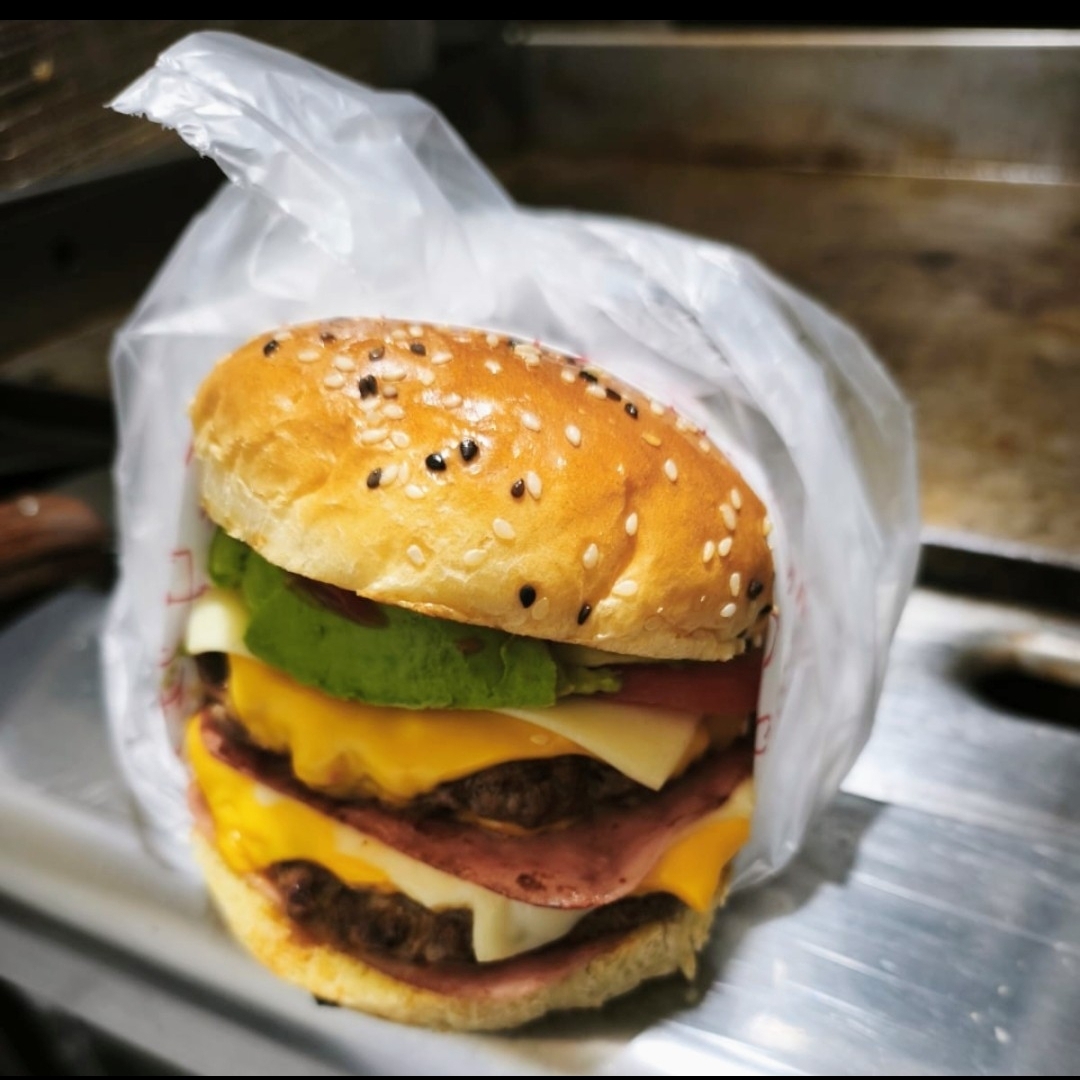 Doble carne de res receta casera, pan parrillero, doble jamon, doble queso amarillo, queso suizo, aguacate, jitomate, cebolla caramelizada, chiles toreados