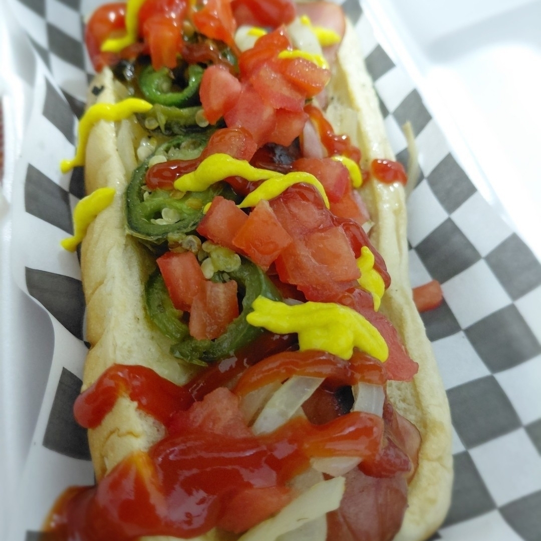 Salchicha de res tamaño jumbo, jitomate, cebolla caramelizada, chiles toreados, mayonesa, catsup y mostaza